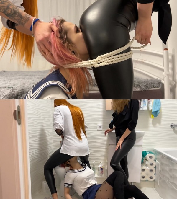Bully students Jucy and Agma bully their classmate after class. A submissive uniformed girl does their homework at the behest of her tormentors while Agma and Jucy have fun with their friends. But this is not the worst thing that awaits a submissive girl today, because when the hooligan girls returned, they immediately began to humiliate the slave girl. The dominant girls immediately began to punish the slave girl for doing her classmates’ homework poorly, Jucy slaps her and hits her with a book. After that, the girls order the submissive bitch to kiss their pussies and asses. Mistress Jucy in leather pants put her hands on the wall with her ass sticking out, and Mistress Agma grabbed the slave girl by the hair and pressed her face into Jucy’s ass. A submissive girl in fear kisses her classmate’s ass and then Agma came up with an interesting idea – she took a rope and tied the slave girl’s head to Jucy’s ass. After that, the dominant girls took turns saddling the face of the slave girl. As the slave knelt before Mistress Jucy, the Mistress kicked the bitch in the face with her foot, then seemed to apologize and immediately kicked again while mocking the miserable lesbian slave. After the slave girl kissed the feet of the Mistresses, Jucy grabbed her and led her to the toilet after her. Here, the horrified slave girl was waiting for even more humiliation. The owners took the bitch by the hair and lowered her face into the toilet, ordering her to take water into her mouth there, then lifted her up to make sure that her mouth was full of water from the toilet, and then ordered her to swallow everything. Then the dominant lesbians continued to humiliate the slave girl with the help of the toilet, putting her face into the toilet and putting on the toilet rim on top. The Mistresses ordered the submissive girl to put her head on the open toilet bowl face up, and they themselves began to sit on her face, saying that now she is their toilet and humiliating her verbally.