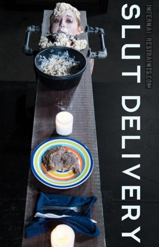 OT knows which places in the neighborhood have the hottest delivery girls. You know, just so he can have some eye candy when his meals come. But Kleio Valentien shows up, a piece of meat carrying a piece of meat, and she doesn’t just drop her bag off and leave. Instead she decides to take a tour of the dungeon, and the interest she shows to the device in the center of the room doesn’t go unnoticed. If she’s willing to walk up to it, stick her head in, and run her hands over the construction, surely she has to be at least a little bit curious as to how it feels to be locked inside of it.She doesn’t seem as enthusiastic when OT has his hands on her, though. She’s whimpering and crying while he strips the clothes off of her body, desperately trying to cover herself with bound hands. When she feels the whip across her back for the first time she begins screaming into the black ball gag crammed into her mouth and violently struggling against the wooden stock that holds her neck. Unfortunately for her, OT doesn’t even need to unlock her to move her around in this device. She isn’t going anywhere. They are going to enjoy dinner and a date together.